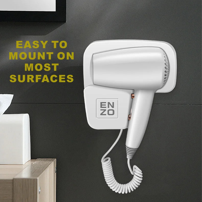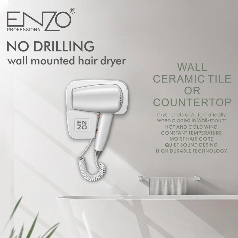 El Secador de Pelo de Pared ENZO EN-6005 es la solución perfecta para cualquier espacio comercial o moderno que requiera funcionalidad profesional y máxima seguridad, como hoteles y gimnasios. Su diseño de montaje en pared ahorra espacio en encimeras y su construcción está optimizada para ser resistente a la humedad. La característica clave de apagado automático al colocar el secador en el soporte garantiza la seguridad eléctrica y el ahorro energético, cumpliendo con los estándares de la industria hotelera.